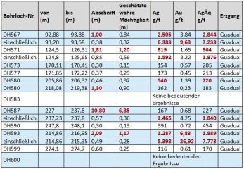 Die wahren Mächtigkeiten der Mineralisierung sind aufgrund des aktuellen geometrischen Verständnisses der mineralisierten Abschnitte unbekannt.