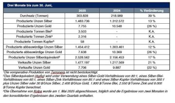 Endeavour Silver Corp. („Endeavour“ oder das „Unternehmen“) (NYSE: EXK; TSX: EDR – https://www.commodity-tv.com/ondemand/companies/profil/endeavour-silver-corp/) meldet für das zweite Quartal 2025 eine Produktion von 1.483.736 Unzen Silber und 7.755 Unzen Gold, was in Kombination mit der Basismetallproduktion einer Silberäquivalent(1)-(„AgÄq“)-Gesamtproduktion von 2,5 Millionen Unzen entspricht. „Wir haben im zweiten Quartal eine starke und Weiterlesen…